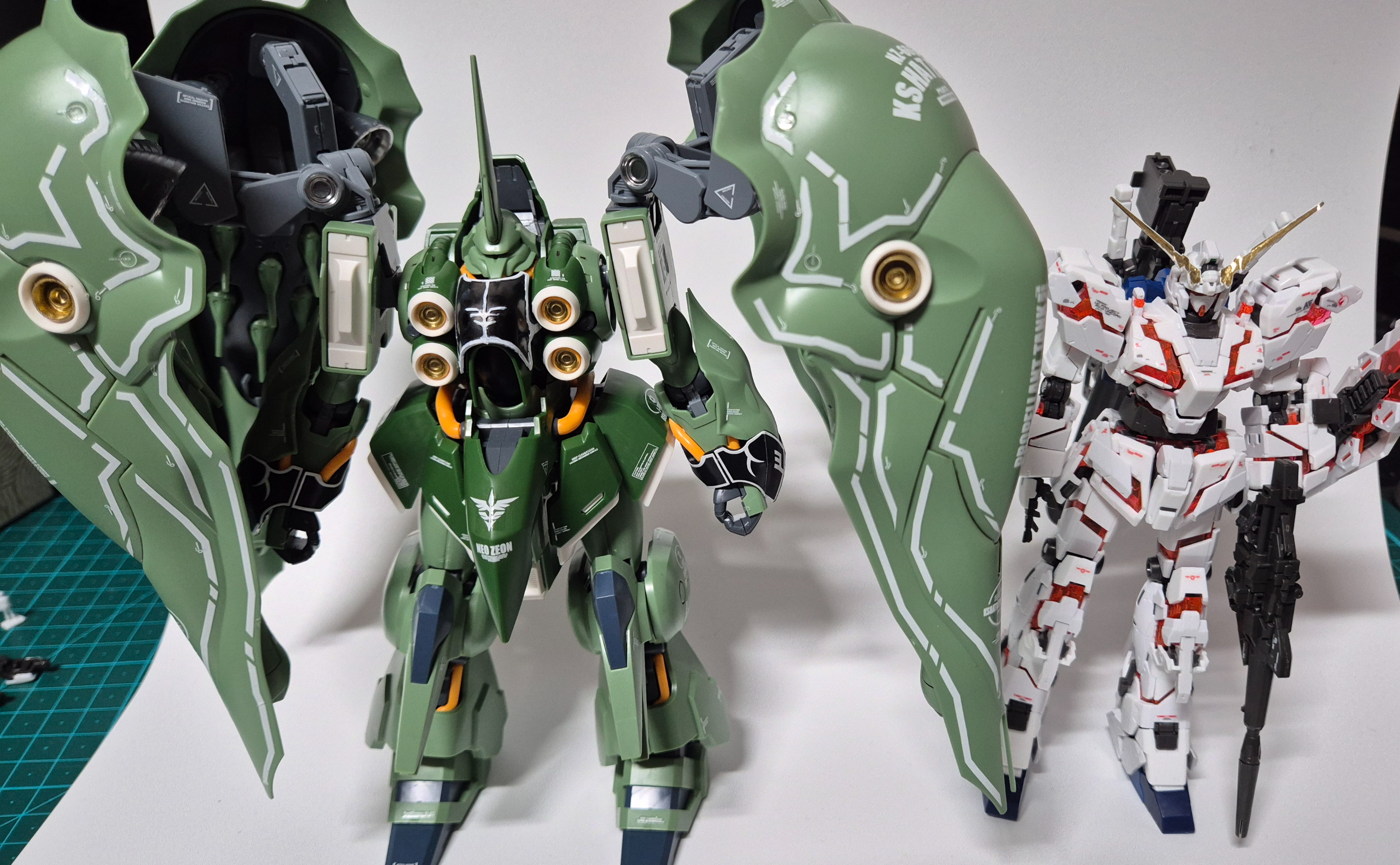 장식장에 있던 HG 크샤트리아와 나란히 세워보았습니다. 덩치 차이가 상당하죠? 크샤트리아의 볼륨감 옆에서도 유니콘의 정교한 디테일은 전혀 꿀리지 않는 존재감을 보여줍니다.