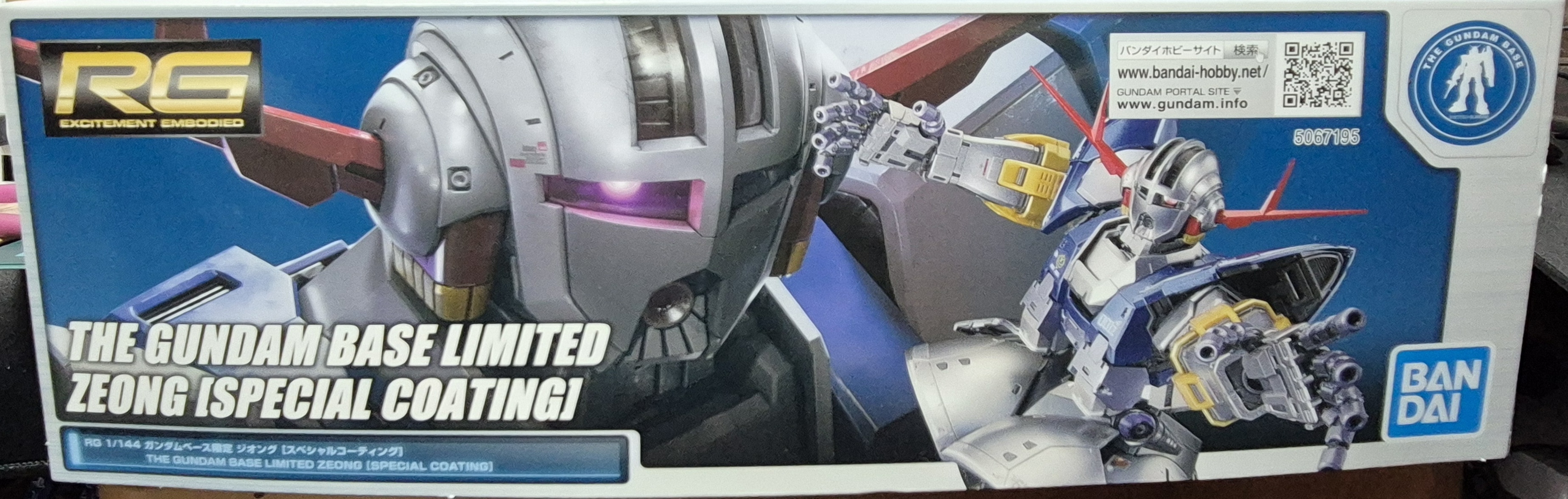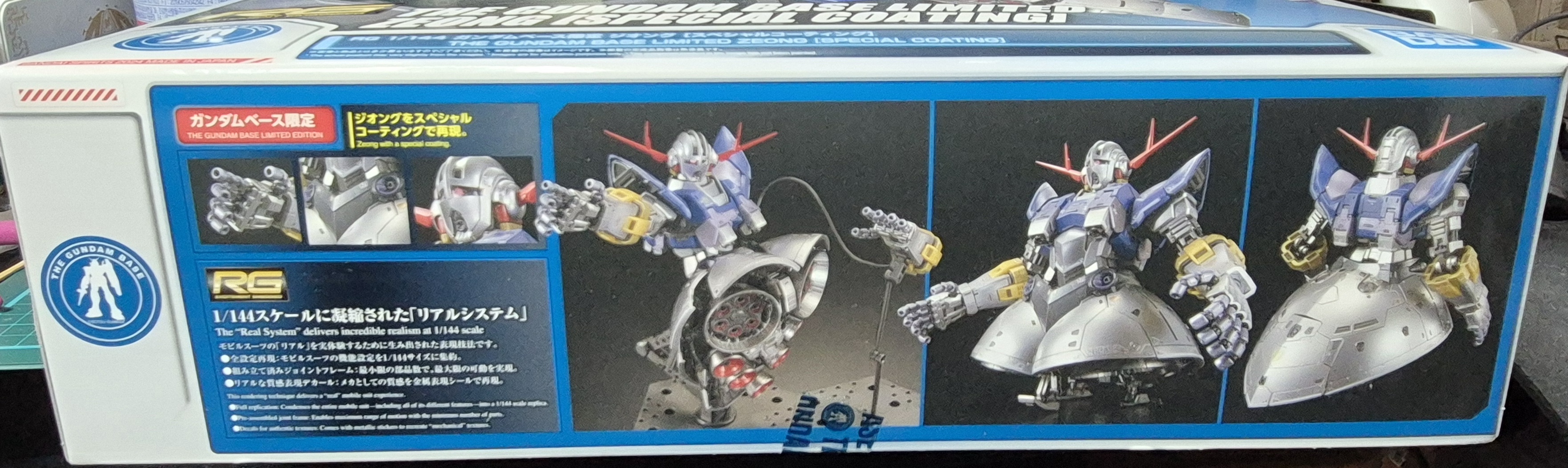 - 색감 & 디자인 — 화이트/블루 톤 박스에 메탈릭 실버 지옹이 돋보이게 배치. 일반 RG 지옹 박스보다 훨씬 럭셔리하고 프리미엄함. 건담 베이스 로고 + "GUNDAM BASE LIMITED" 마크가 큼직하게 들어가서 소장욕 자극 max.